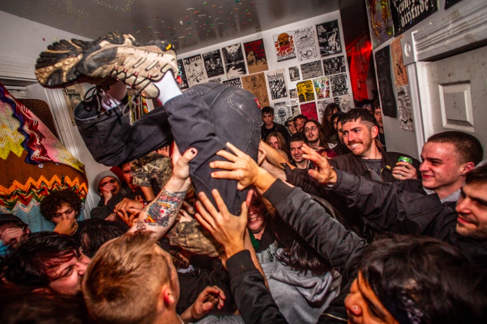 I’m glad I went to my last house show after taking way too much time off. A couple of weeks ago, the Richmond D-beat band Destruct organized a DIY undisclosed-location show to raise money for Palestinian relief. The bill was all locals, and it felt good to be there, even if I literally could not get into the room. I’m not in the photo at the top of this page, even though I’m taller than everyone in that room, because it was just not physically possible to be there. I was just outside, craning my neck around a hallway corner, taking in the whole scene without actually being able to watch anyone in any band. And that’s fine! Nobody’s going to a house show to witness a great performance, anyway. It’s the communal experience of the thing.