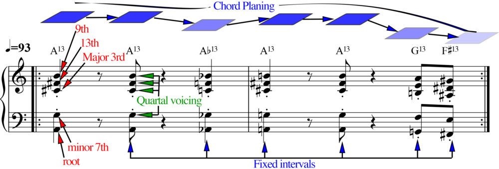 And this is the crucial point: The appeal of chord planing is that it allows you to transgress, smoothly and gracefully, the boundaries of diatonic harmony (the notes and chords that belong to a given key center), without having to worry about usual chord functions or common-practice counterpoint. In traditional Western harmony, orchestrators or performers often re-voice chords to preserve notes shared between adjacent chords for smooth voice leading. But the sound of planing has become its own distinctive style. You can hear it throughout the modal jazz canon — in the music of Miles Davis, McCoy Tyner, Herbie Hancock, the list goes on.