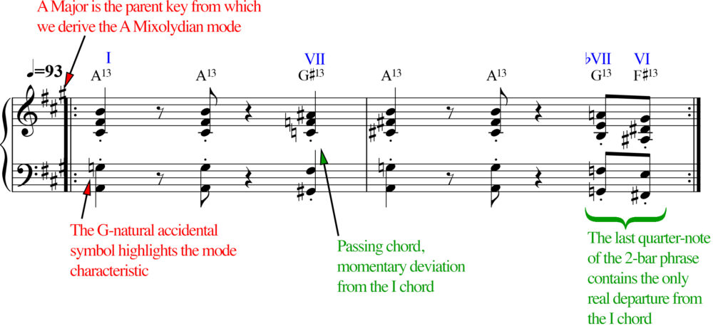 My best answer to the “What key is this song in?” question is… (drumroll please): A Mixolydian. That is to say, it’s based on the collection of notes we associate with D Major (Ionian), but it’s centered on A. Think of an A Major scale with a Gâ™® replacing the usual G# as the 7th scale degree. All the accidentals we hear (outside of A Mixolydian), like G#, A#, Câ™®, D#, exist in the cracks between our scale tones and they serve as attendant diversions to perk up our ears and keep us engaged.