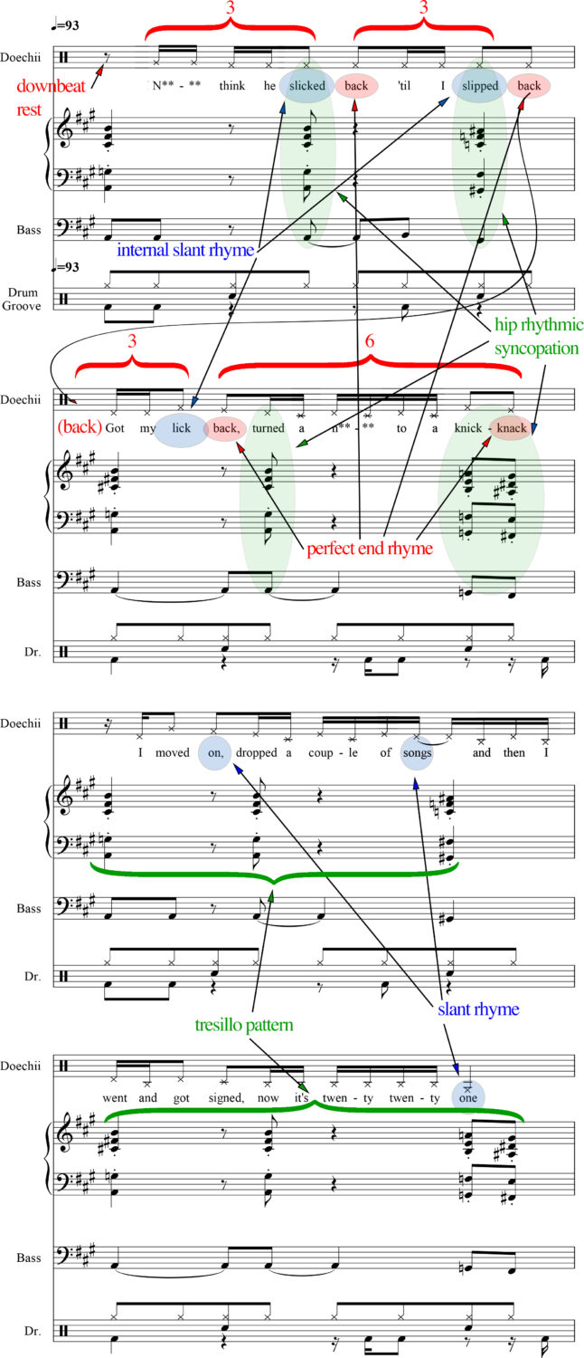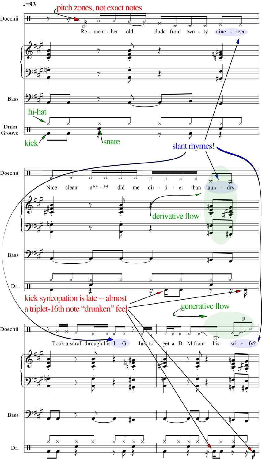 One more thought to close out this topic, before we get to Doechii’s rap flow: NYU music professor Ethan Hein has postulated that any series of chords, no matter how arbitrary or incoherent, can sound “correct” if accompanied by a satisfying breakbeat drum loop. By extension, rapping over any chord loop, even if the chords were chosen at random, can legitimize the loop. (I’m reminded of Adam Neely’s “repetition legitimizes” refrain, which he got from Dave Johnson at Berklee.) When referencing “Denial Is A River” specifically, Hein suggests the chords are arbitrary, implying that any other harmonic choices would’ve worked just as well. While I think there’s merit to his argument in the macro sense, I don’t agree in this instance based on my analysis above. The “Denial Is A River” chords invoke a specific, carefully calibrated mood. That mood informs Doechii’s rap flow, which in turn imparts color and texture to the chords and drum beat. There’s a symbiotic relationship between the two. Even though they were created separately, they sound inextricably linked.