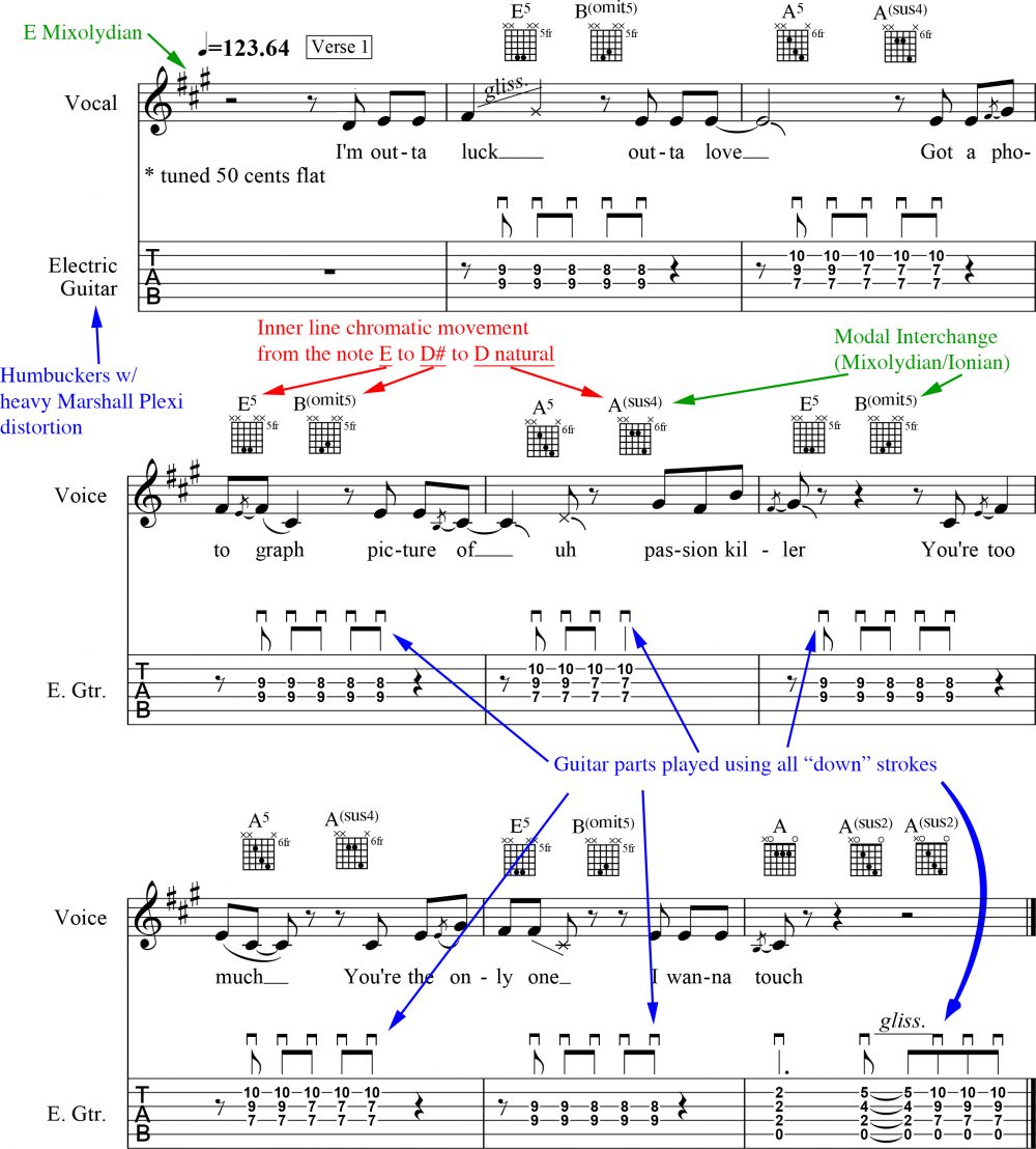 [Note: Those of you with perfect pitch will immediately hear that the song is tuned down roughly a quarter tone — with the key center about halfway between E♭ and E. (Def Leppard guitarists Steve Clarke and Pete Willis played their respective parts using ordinary EADGBE tuning, but it’s approximately 50 cents flat.) For simplicity, let’s reference “E” as the key center here, and proceed as though it’s tuned to A=440Hz, the pitch standard in the US and UK.]