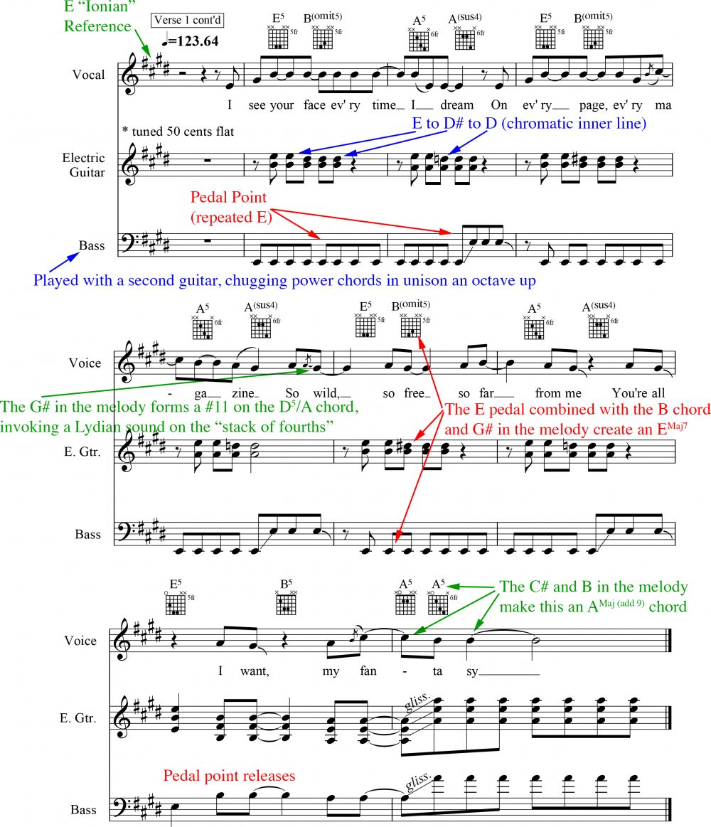 And how about in Def Leppard’s “Photograph”? Returning to Figure 3 above: The reason this pedal point harmonic device works so well here is that the “E” bass note acquires a different meaning under each chord. In turn, the bass note imbues a new personality to each chord on top of it — i.e., it imparts some trait the chord didn’t previously possesses on its own.