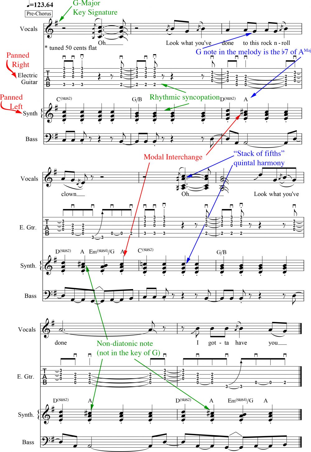 On the first EMaj, the pedal point is at home, at rest. But when the BMaj enters, the pedal point modifies the role that chord plays; instead of serving as the V chord relative to the tonic (I), it now sounds a bit like an EMaj9, a more vibrant variation of the chord that preceded it. The D# note in the BMaj chord creates a little intervallic friction with the pedal because it’s a half step (semitone) away — but the spread voicing produces a pleasant kind of dissonance. Next, on the AMaj, the pedal point affects the chord’s sense of stability, making it crave resolution because it’s now in second inversion (it’s no longer a simple root-position IV chord). When the Asus chord enters, the pedal point heightens the unresolved harmonic tension further — infusing it with a greater sense of anticipation because it’s now effectively a “stack of fourths,” with the notes E-A-D. (For more info on stacked fourths, check out a previous article, on Silk Sonic’s “Blast Off,” where we discuss quartal harmony and open chord voicings.) The G# in the melody produces a wondrous “Lydian” sound over the stack of fourths because that note is a raised 4th interval up from the D and a Major 7th interval up from the A. Who would have thought such subtle-but-delicious harmony would come from a band that shares much of its musical DNA with AC/DC?