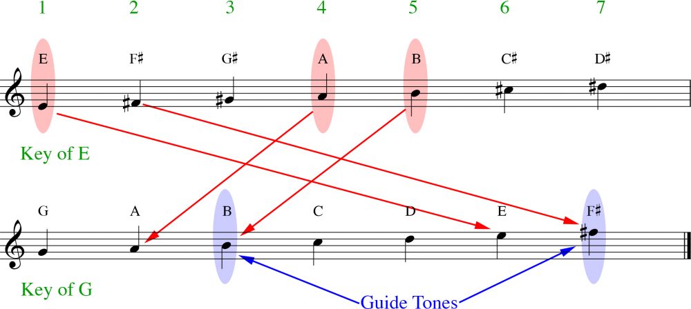 As we can observe above in Figure 5, the fundamental (1, 4, and 5) scale degrees in E Major are also present in G Major. Further, we can find G Major’s harmonically vital guide tones (3 and 7) in the key of E Major. So when pivoting the harmonic axis to this unrelated key center, we hear that there’s still some tonal glue holding them together. But E Major and G Major do sound jarringly disconnected because the former’s guide tones don’t survive the key change to the latter. (The notes G# and D# don’t live comfortably in G Major — at least, not in the “Ionian” mode Def Leppard is using here.) Indeed, it’s the specific common and differentiated notes that makes this particular modulation so evocative. And it’s why the key change in the pre-chorus of “Photograph” creates such a commanding lift.