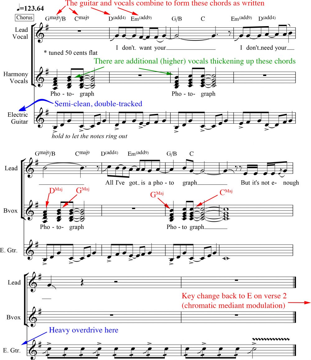 The chord movement from EMaj to BMaj to Asus creates a lovely descending chromatic line embedded within the progression: the note E (the root of EMaj) to D# (the Major third of BMaj) to D♮ (the “4” in Asus). This inner-line movement implies shifting modality between the bluesy-sounding Mixolydian mode and the familiar “Ionian” mode heard in most European Classical music (think of the notes that go along with Do, Re Mi, Fa, Sol, La, Ti). The juxtaposition of the D# and D♮ (the natural 7th and flatted 7th scale degrees, respectively) creates a kind of tonal rub that helps to give the “Photograph” verses a vaguely abrasive edge. (Of course, the overdriven guitar sound bolsters this crunchiness. More on this later.)