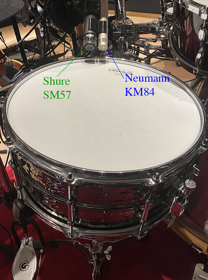 The drum sound you hear on “Photograph” maintains the colossal size and depth of field you hear on “Let It Go,” but there’s a notable difference: On “Photograph,” the drums sound even bigger and they’re all programmed, not played. To maintain maximum flexibility, they sampled a number of snare and kick drums into the Fairlight CMI audio workstation and programmed Rick Allen’s drum patterns. The enormous backbeat you hear on “Photograph” resulted from layering, pitching down, and processing a variety of superimposed snares — most notably the Ludwig Black Beauty. This drum happens to the most-recorded snare in history (for heavy rock music), and for good reason: It has an extremely wide tuning range and it cuts through dense mixes easily. Mike Shipley and Mutt Lange captured the sound using a combination of the venerable Shure SM57 (for the mid-range) and the Neumann KM84 (for the highs and lows). See Figure 8 below.