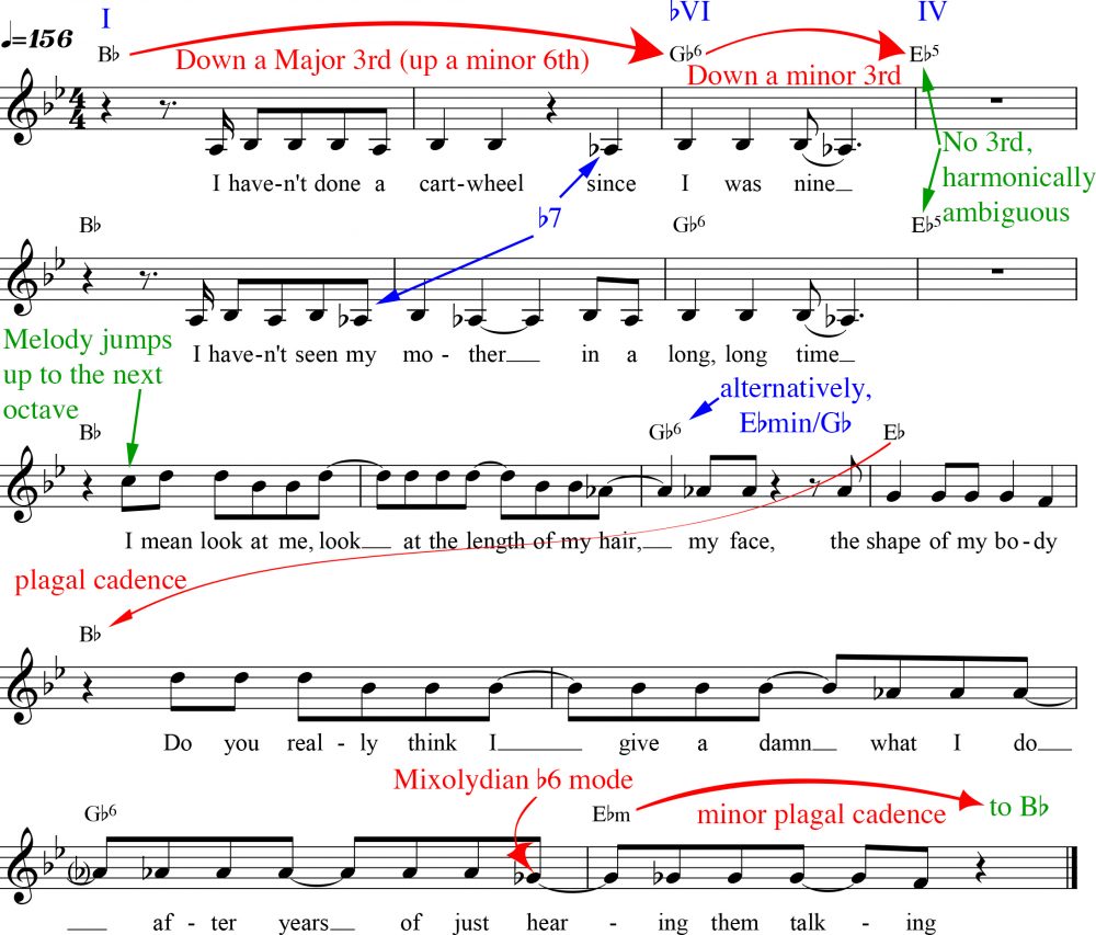 Lana’s use of Mixolydian Flat 6 at the end the first verse facilitates the expressive minor plagal cadence that brings us to the song’s chorus section. This is because, in the key of B♭, the flatted 6th scale degree (G♭) forms the minor-3rd interval on the IV (E♭5) chord — effectively turning it into an E♭min.