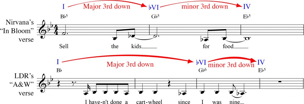 Returning to Kurt Cobain: can you spot his direct connection to Lana Del Rey? The verses of Nirvana’s “In Bloom” (and to some extent, “Heart Shaped Box”) employ the same chromatic mediant relationships as the verses of “A&W.” See Figure 3, below.