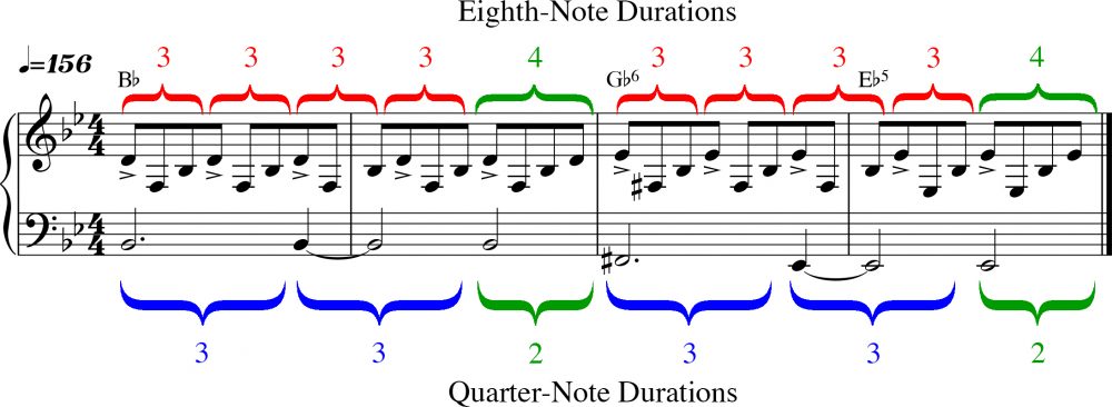 It’s interesting that this rhythmic figure is related to the popular pattern known as “tresillo,” which we hear quite a lot in Latin-American music. Tresillo (meaning “triplet” in Spanish) derives from an essential Sub-Saharan African rhythm that uses a contrasting duple-pulse “cross beat” cell. It eventually found its way to the Caribbean Islands via the horrific institution euphemistically called the Transatlantic slave trade — ultimately yielding the Afro-Cuban clave pattern that emerged in the late 19th and early 20th Centuries. In essence, tresillo is a repeated figure that uses just the first bar in a traditional 3:2 clave pattern. Take the rhythm accents from only the first or third bars of the “A&W” verse, shown above in Figure 5, and repeat that pattern. There you have it: instant tresillo!