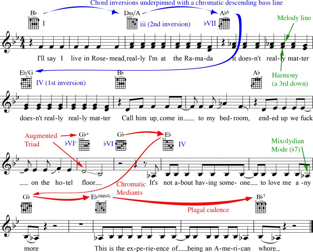One of the hallmarks of Lana Del Rey’s songwriting is the impeccable way her music composition buttresses her lyrics. On the line, “ended up we fuck on the hotel floor,” the phrase concludes with Lana sliding down from a D to a B♭ (a Major third interval) in her melody, over a G♭ chord root. This combination yields a G♭ augmented triad — i.e., a G♭ Major chord but with the 5th raised a half step. Augmented triads (denoted with a “+” symbol) possess a sound that we could describe as “enigmatic,” or even “troubled” (depending on the harmonic framework), and these unstable chords carry a lot of dramatic tension. In the context of the “A&W” chorus, the surprising G♭+ chord perfectly represents the unexpected turn in the lyric, which helps to make Lana’s narrative feel believable.