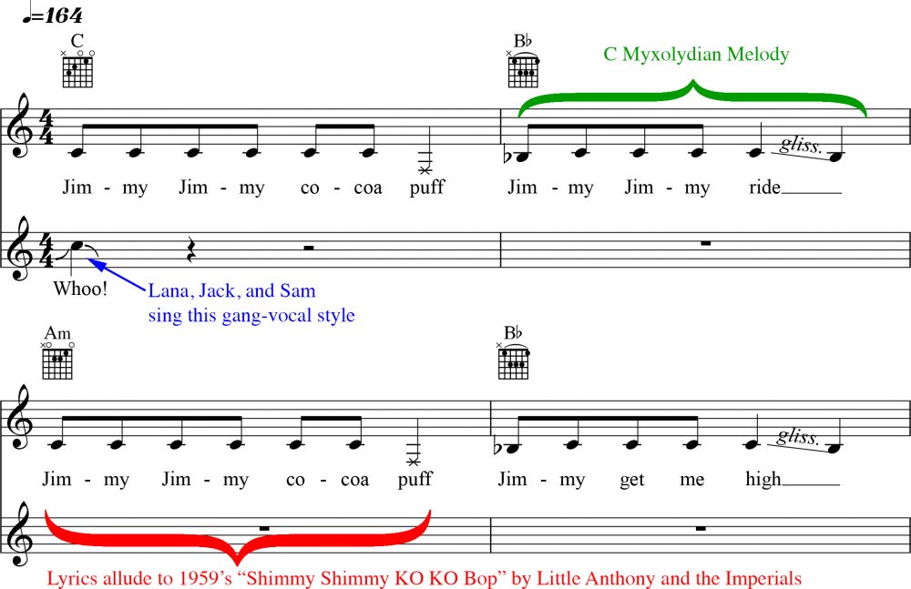 The organic instruments we’ve heard up to this point in the song give way to Jack Antonoff’s menacing Moog bass and synth pads fed through an arpeggiator. We’ve drifted into an entirely different sonic world – a foreboding one, replete with 808 trap beats, a portamento synth bass, and filter sweeps. Are we still listening to “A&W”? Indeed, they stitched what sounds like an entirely new song on to the end, segueing to the new section via a 3-bar ritardando (gradual decrease in tempo) in Pro Tools. There’s a kind of tempo-mapping sleight-of-hand here, as the slowdown morphs into a new quasi-hip-hop beat at a deceptively faster tempo (164 bpm, up from 156.1 bpm). The song modulates up a whole step from Bb to C, and it’s here’s that we meet a character named Jimmy. See Figure 7, below.