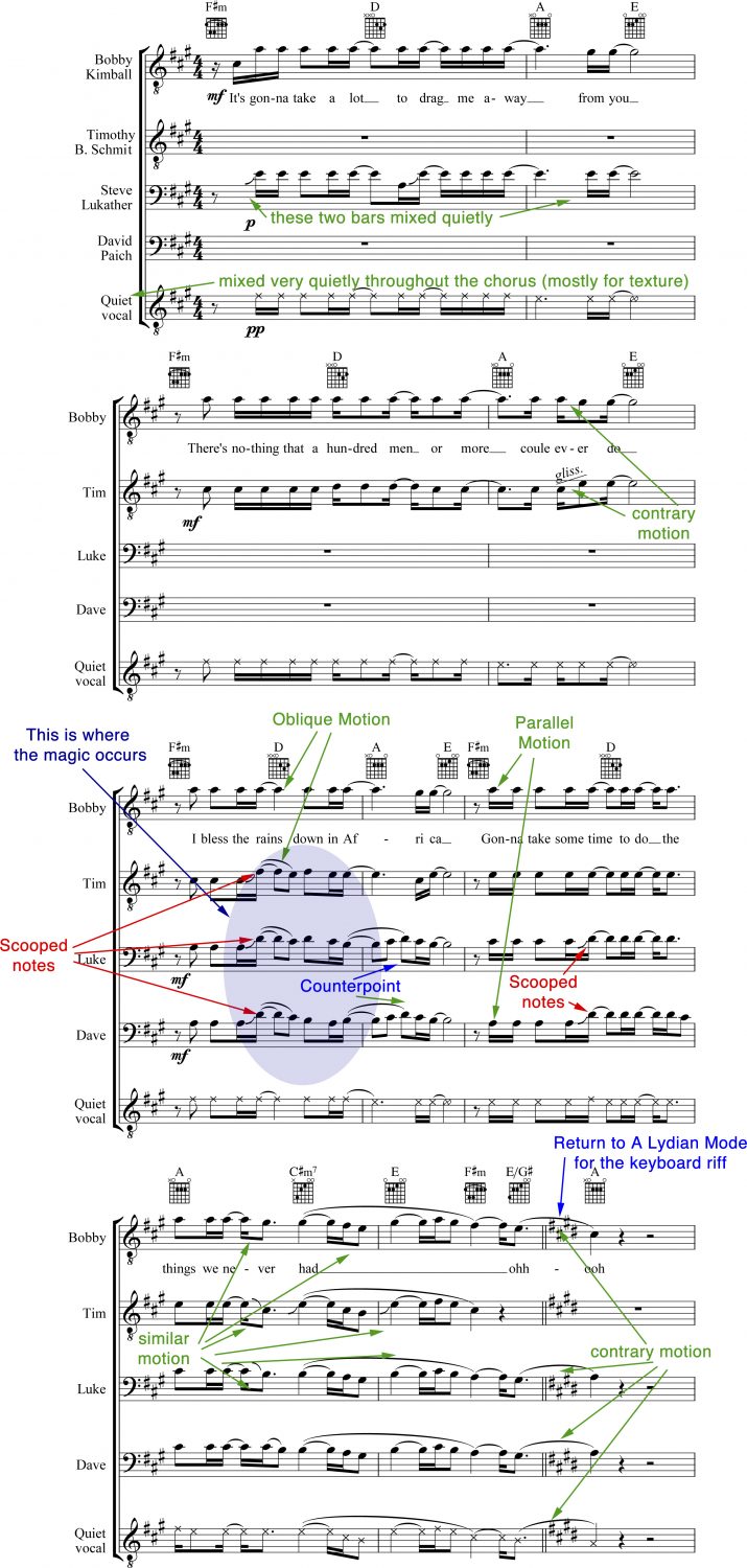 For me, the most thrilling part of the chorus (in fact, the whole song) is the harmony created by the superposition of Schmidt’s, Lukather’s, and Paich’s scooped notes on the word “rains” while Kimball sings the high “A” in the melody. The moving lines imply a DMaj9 chord there, and the following contrapuntal line works with the melody and harmony like the gears in a Swiss watch. My ear is more drawn to the 2nd, 3rd, and 4th voices in this figure than it is to the ostensible top melody, as the lower voices are singing the most captivating parts. It’s all beautifully constructed.