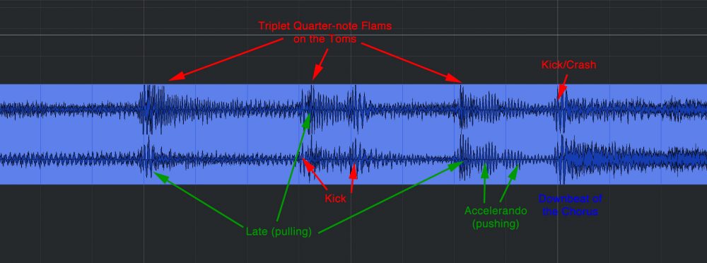 When a drummer “pushes,” it means they’re playing slightly ahead to drive the pulse forward. “Pulling” means they’re playing ever so slightly behind, or late, to build tension. (Note: This is not exactly the same as “rushing” and “dragging,” which relate to increasing or decreasing the overall tempo — usually in an undesirable way.) Famously, Charlie Watts of the Rolling Stones tended to play his kick drum slightly ahead (pushing), while his snare backbeat was slightly behind (pulling), resulting in a confident groove with an incredibly slinky feel. Every drummer has a signature time feel — a tendency — that’s as distinctive to them as the shape of their face. There’s no mistaking John Bonham’s signature time feel for James Gadson’s, or Bernard Purdie’s time feel for Stewart Copeland’s. Josh Freese, Sheila E., Ringo Starr, Elvin Jones… they’re each instantly recognizable by their respective time feels — i.e., by where they choose to place beats, either slightly ahead, or slightly behind, or right on top.