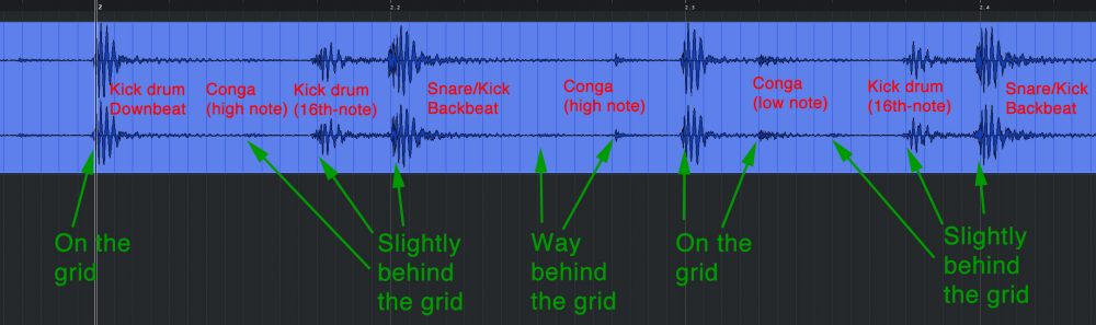When principle songwriter and keyboardist David Paich sings “I hear the drums echoing tonight,” he means it figuratively. But the iconic opening groove, played in a loop by greatest-drummer-of-all-time Jeff Porcaro and percussionist-extraordinaire Lenny Castro, makes those metaphorical drums literal. There’s a natural fluidity to Porcaro’s deep-pocket feel, as the kick drum’s strong beats land exactly in the middle of each quarter note, while the 16th-note lead-in kicks and the snare drum backbeats fall slightly late (we’re talking around 10 milliseconds). Moreover, Castro’s syncopated conga pattern lands even further behind the 16th-note grid. This execution is not sloppy, but extraordinarily precise, resulting in a kind of organic push-pull effect that imparts a sense of both weightiness and excitement. (More on this later.) See Figure 1 below.