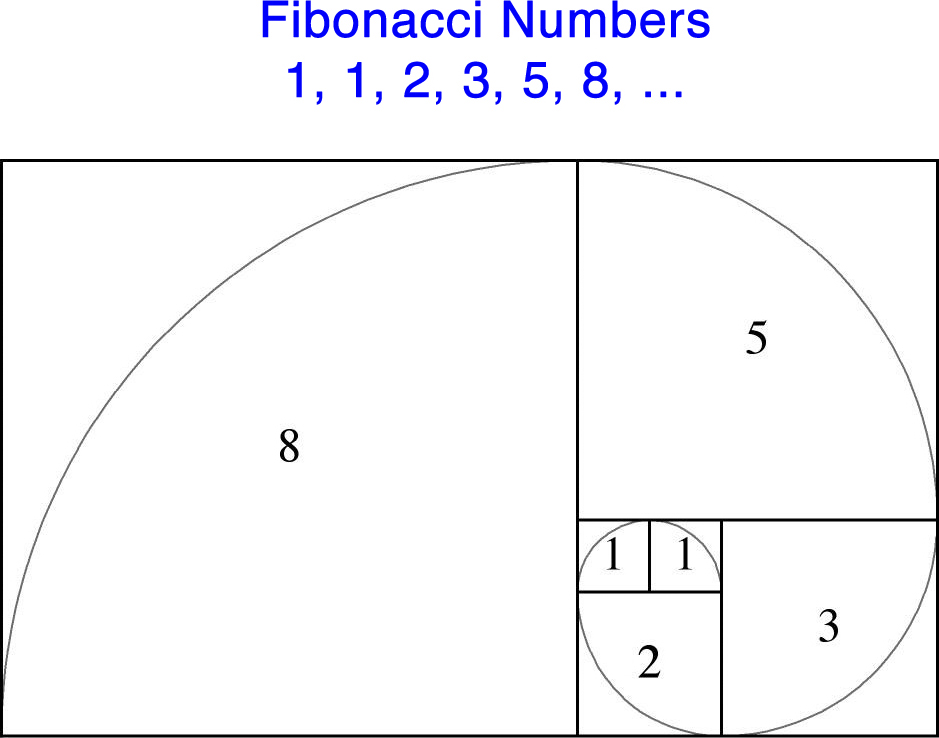 If you take squares whose dimensions correspond to the Fibonacci numbers and arrange them into neatly stacked expanding adjacent rectangles, you can observe how the shapes give rise to a logarithmic spiral. For every 90-degree turn, we see a growth factor approximating φ, and the further along it gets, the more closely it converges on the Golden Ratio. See Figure 4 below.