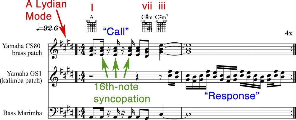 On the recording, Paich played the “call” figure using a Yamaha CS80 analog synthesizer — an instrument probably most associated with Vangelis (think of the music scores for Blade Runner and Chariots Of Fire.) The “response” figure comprises a C#-minor pentatonic-based melody using parallel 4th intervals that requires two hands to play. For this, he employed a Yamaha GS1 synth (a precursor to the mid-’80s ubiquitous DX7). There’s a common assumption that this distinctive instrumental section lives in the key of A — and it does, sort of. But it’s A “Lydian” mode: i.e., it uses the notes of the A-Major scale, except with a raised 4th scale degree (D#) — which is the only reason the G# minor chord is able to work so seamlessly. See Figure 3 below. The G# minor functions mostly as a passing chord here, but Paich uses it to plant a seed for a harmonic surprise soon to come in the verse section. (More on that later.)