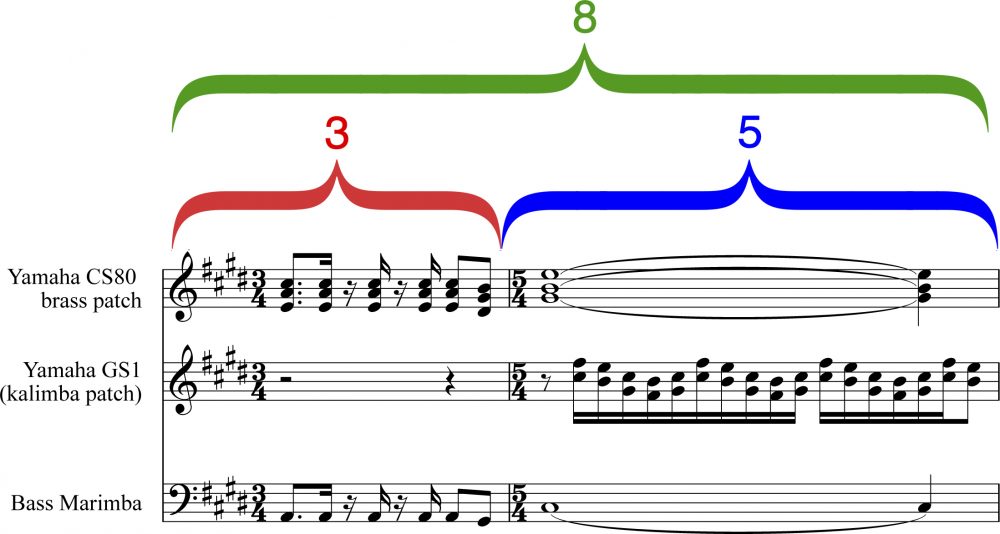 Figure 6: "Africa" Keyboard Riff Metered to Reveal the Fibonacci Numbers 3, 5, 8