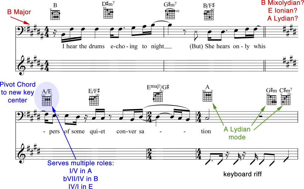 The first two bars of the verse use fairly standard pop chords: the I, iii7, vi7, and I/V. The third bar is where David Paich’s harmonic superpowers spring into action. The A/E is the 2nd inversion of a â™VII chord in the key of B. In jazz harmony, we can use this chord as substitute for the V chord — so it’s not terribly unusual. But in this instance, Paich uses it to double as a pivot chord to a new key center.