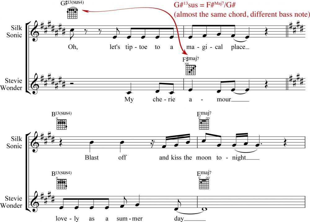 When I first listened to “Blast Off,” I assumed I hadn’t heard that progression before … until I realized it shares the same harmonic structure as the “A” section of Stevie’s Wonder’s “My Cherie Amour.” I’ve always been awestruck by Stevie’s deft harmonic pivots, his ingenious musical phrasing, and the richness of his harmonic vocabulary — and I imagine Mars and .Paak feel the same. So it makes sense that Silk Sonic would want to build on Stevie’s work, which they do cleverly, using the subtle chord substitution shown in Figure 5.