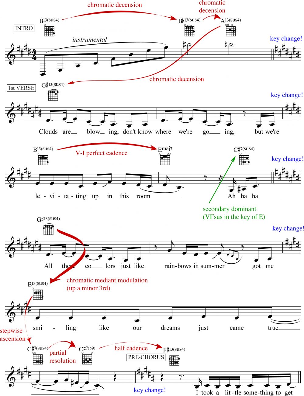 What follows next is the B13sus to EMaj7 cadence, which is the song’s only recurring instance of a traditional V-I resolution. It’s when Anderson .Paak finishes the line, “levitating up in this room,” and the release of tension feels both relieving and nourishing. But the respite is fleeting, as we’re quickly lifted back into suspension with the C#7sus pivot, returning us to G#13sus. In the transition from verse to pre-chorus, Mars and .Paak deploy a kind of “half cadence.” We hear the C#7sus resolve to the C#7, which craves resolution to F#Maj in a Bach-approved V7-I perfect cadence. But when the F# chord arrives, it comes in the form of … you guessed it, an F#13sus, resulting once again in meandering, unresolved harmonic tension. This sus chord undergirds Bruno Mars’ line, “I took a little something to get here, yeah, yeah,” and I can imagine him singing that melody with a sly wink and nod, knowing he’s subverted expectations by sneaking in that deceptive cadence. Seriously, these guys know what they’re doing.
