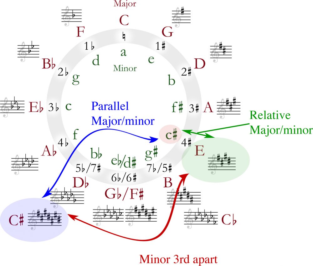 The G#13sus to B13sus motif creates a huge lift, and even though it’s a recurring theme, it feels unexpected every time it happens. This is because the modulation has the effect of a minor 3rd key transposition, which is one type of “chromatic mediant” modulation. (For more on this, see the In Theory article on Nirvana’s “In Bloom.”) Changing key centers upwards by the distance of a minor 3rd sounds so dramatic because it’s akin to shifting the axis of the song from a Major key to its parallel minor key. For example, going from C# Major to E Major feels like going from C# Major to C# minor (because E Major and C# minor share the same key signature, as the latter is the “relative minor” of the former). See Figure 3, below. While the key centers of C# Major and E Major share some common tones, the really crucial ones (the 1st, 4th, and 5th scale degrees) are different — and this is what makes the shift so effective. (For more detailed background on this, see the In Theory article on Lorde’s “Solar Power.”)