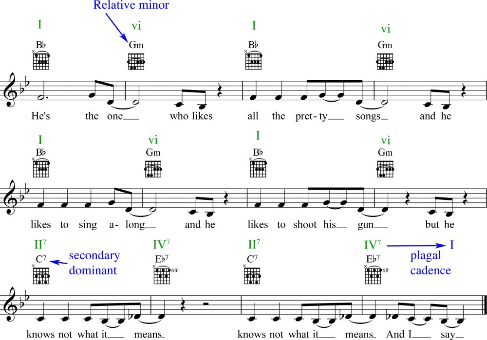 After hearing the distant, unrelated chords that characterize the jagged, disorienting verses (see Figure 4, above), the chorus provides a bit of harmonic relief with a recognizable I-vi pattern (Figure 5). On the line “knows not what it means,” we hear an unexpected borrowed chord, the II7 (or the “V7 of V”): a secondary dominant. Here we can observe the Beatles influence Kurt spoke about in interviews. Following this, we hear another Kurt Cobain trademark, discussed above: the chromatic mediant relationship (with the C7 going up a minor third to E♭7). The chorus then resolves in a variation of what we call the “plagal cadence” — a IV to I resolution associated with church hymns. There’s something comforting about this cadence (think of the way the refrain of the Beatles’ “Yesterday” resolves), but Kurt’s use of the dominant 7 interval over the E♭ gives the chord a harder edge. It’s the cadence heard on the Beatles’ “Taxman.”