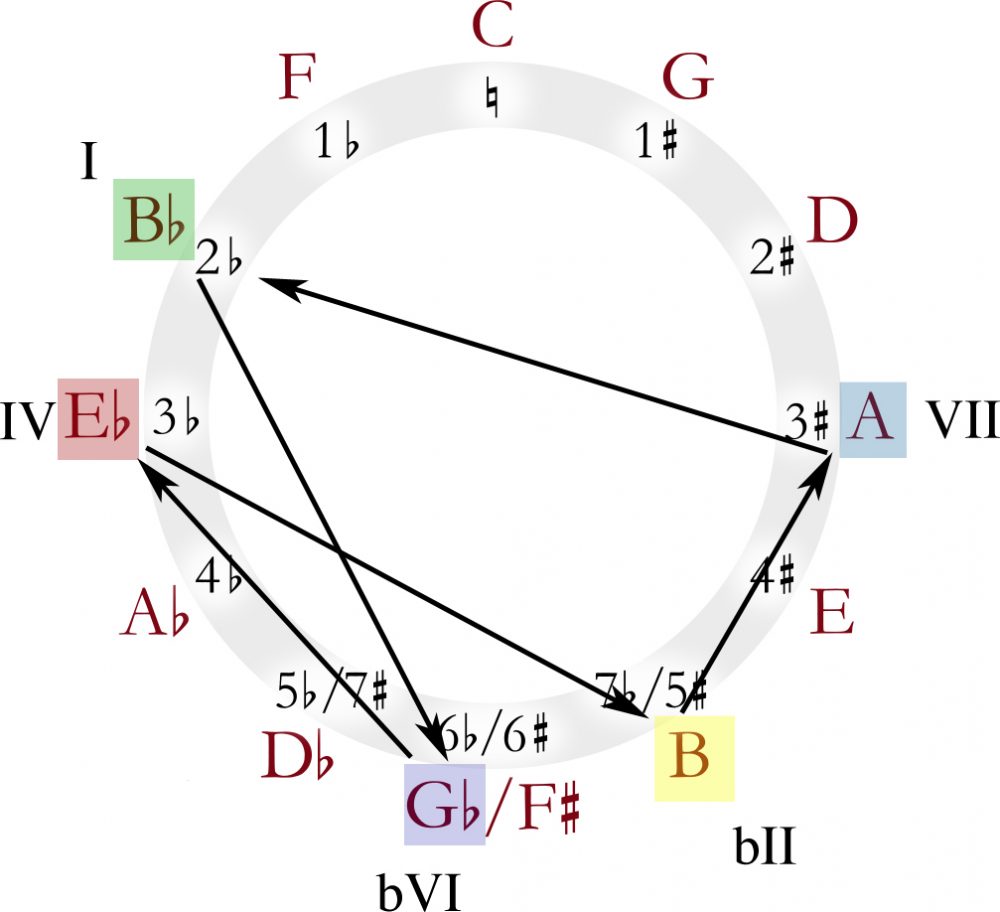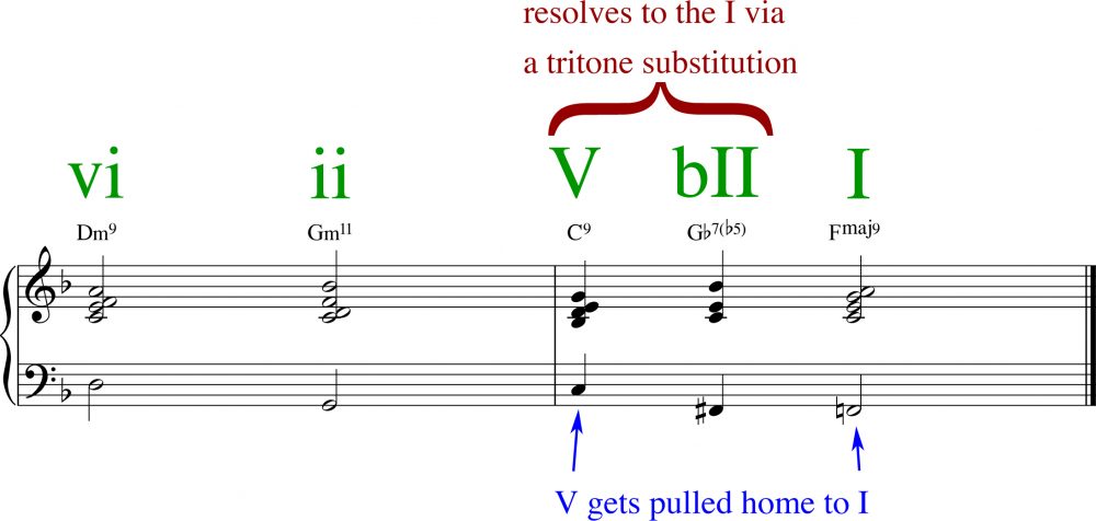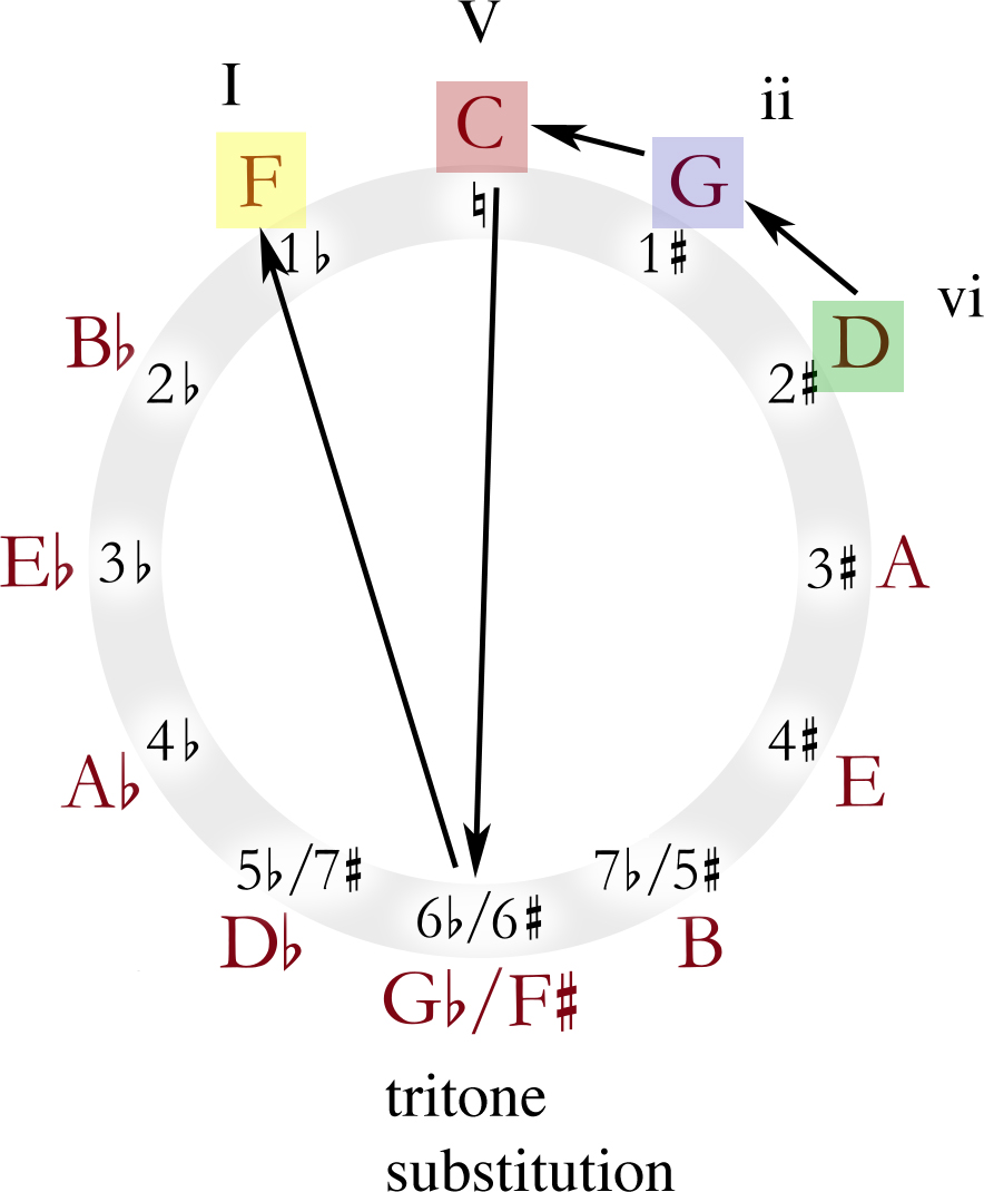 You’ll notice that each chord serves a particular function, forming a deliberate “story arc” following Circle of Fifths relationships. The tritone diversion serves as a kind of harmonic lubricant for smooth voice leading between the V and I chords. All the chords in the above example are diatonic, except for the tritone chord (G♭7♭5). Most of the Great American Songbook follows these sorts of functional harmonic relationships.