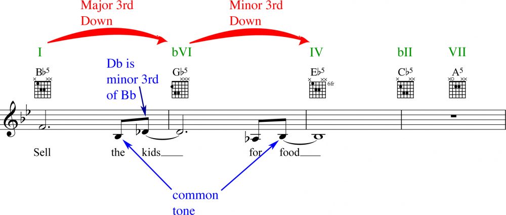 On “In Bloom,” Kurt Cobain played the chords not as triads (containing the root, third, and fifth), but as dyads or power chords (containing only the root and 5th). This afforded him some melodic flexibility due to the chords’ ambiguous quality, where the listener would be unsure whether what they’re hearing is Major or minor. However, the D♭ he clearly sang in the verse melody (e.g., on the word “kids”) would necessitate that the B♭ chord is actually minor — but it’s not. There’s a peculiarity to the way Cobain fretted his power chords — with his third finger barring both the 5th degree and octave above the root (i.e., the third fret on the 3rd and 4th strings, in this case). When doing this, one must be careful not to inadvertently finger the third fret of the 2nd string, which is a D♮. But Kurt wasn’t careful, and throughout the verses you can hear that he occasionally sounded the D♮, making it clear the B♭ power chord is really a Major triad. This means the D♭ he sings in the melody over that chord, every time the verse cycles back to it, is actually a blue note.