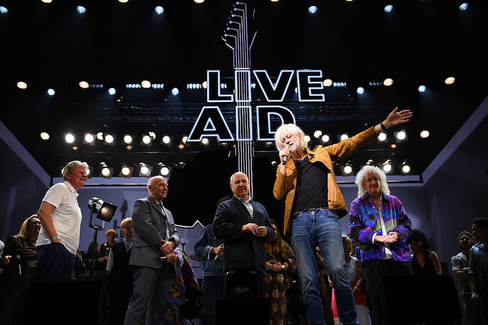 In July 1985, a vast array of mega-popular artists performed at Live Aid, a pair of massive benefit concerts held in London and Philadelphia and broadcast worldwide. Led Zeppelin reunited for the occasion, as did Black Sabbath. Teddy Pendergrass made his first public appearance after being paralyzed in a 1982 car crash. Phil Collins jumped on the Concorde so that he could perform at both concerts. U2’s Live Aid performance is considered a key moment in their rise, and Queen’s set was so legendary that it was recreated in the Oscar-winning film Bohemian Rhaposdy decades later. It was a big deal, and the whole thing happened to raise money for Ethiopian famine relief. Sunday was the 40th anniversary of Band Aid, and concert founders Bob Geldof and Midge Ure marked the occasion by reuniting with Queen guitarist Brian May.