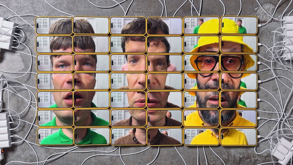 OK Go’s video for their new single “A Stone Only Rolls Downhill” debuted on The Kelly Clarkson Show today, and it’s an endless tessellating tapestry of phone screens, each of which is filming a member of OK Go doing something. It’s hard to explain, but the panorama of phone screens does cool funhouse-mirror things with the OK Go guys’ faces. Damian Kulash co-directed the clip with Chris Buongiorno, and he has this to say about it: